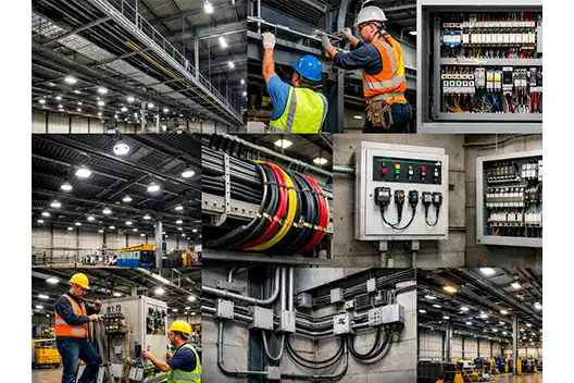 O processo inclui análise da carga elétrica, projeto técnico, distribuição de circuitos, instalação de quadro elétrico, cabos industriais, iluminação e sistemas de proteção.